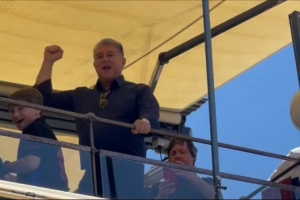 体育资讯4月26日讯 国王杯赛前,拉波尔塔在巴萨董事会聚餐的餐厅与巴萨球迷热情互动。