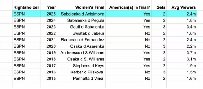 轰轰烈烈的美网大幕落下后,赛后很多人都在关心一个问题:今年男女单收视率和往年相比,是进步了还是退赛了?ESPN第一时间公布了答案!