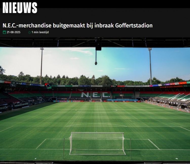 奈梅亨官方表示:“上周,高费尔特球场发生入室盗窃案,此次事件中,价值至少15000欧元的俱乐部周边商品被盗,其中包括原定于8月26日周二起向球迷发售的大量球衣。”