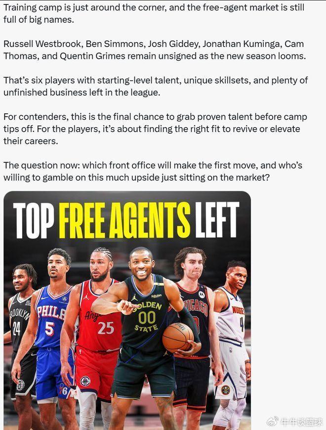 北京时间9月2日,根据美媒统计,在各支球队训练营即将开始的时候,自由球员市场上仍有多名大牌球星,分别是威少、本-西蒙斯、约什-吉迪、库明加、卡姆-托马斯以及昆廷-格兰姆斯。对此,美媒评论称:“这六名球员拥有首发级别的天赋、独特的技能,并且在联盟中还有很多未完成的事情。对于球队来说,这是训练营开始前抓住有经验人才的最后机会。对于球员来说,这关乎于找到合适的角色...