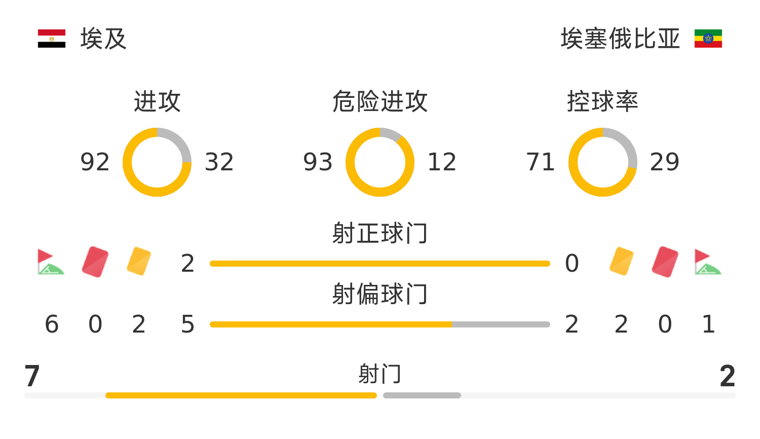 09月06日讯 26赛季世非预分组赛A组第7轮,埃及迎战埃塞俄比亚。半场战罢,双方比分暂为埃及2-0埃塞俄比亚,萨拉赫、马尔穆什双双点射建功。关键事件41’特雷泽盖造点,萨拉赫点射命中,埃及1-0埃塞俄比亚45+1’马尔穆什点射破门,埃及2-0埃塞尔比亚常规事件4’马尔穆什禁区左路抽射打门,门将扑出皮球17’特雷泽盖禁区左路低射,门将倒地将球扑出底线18’费...